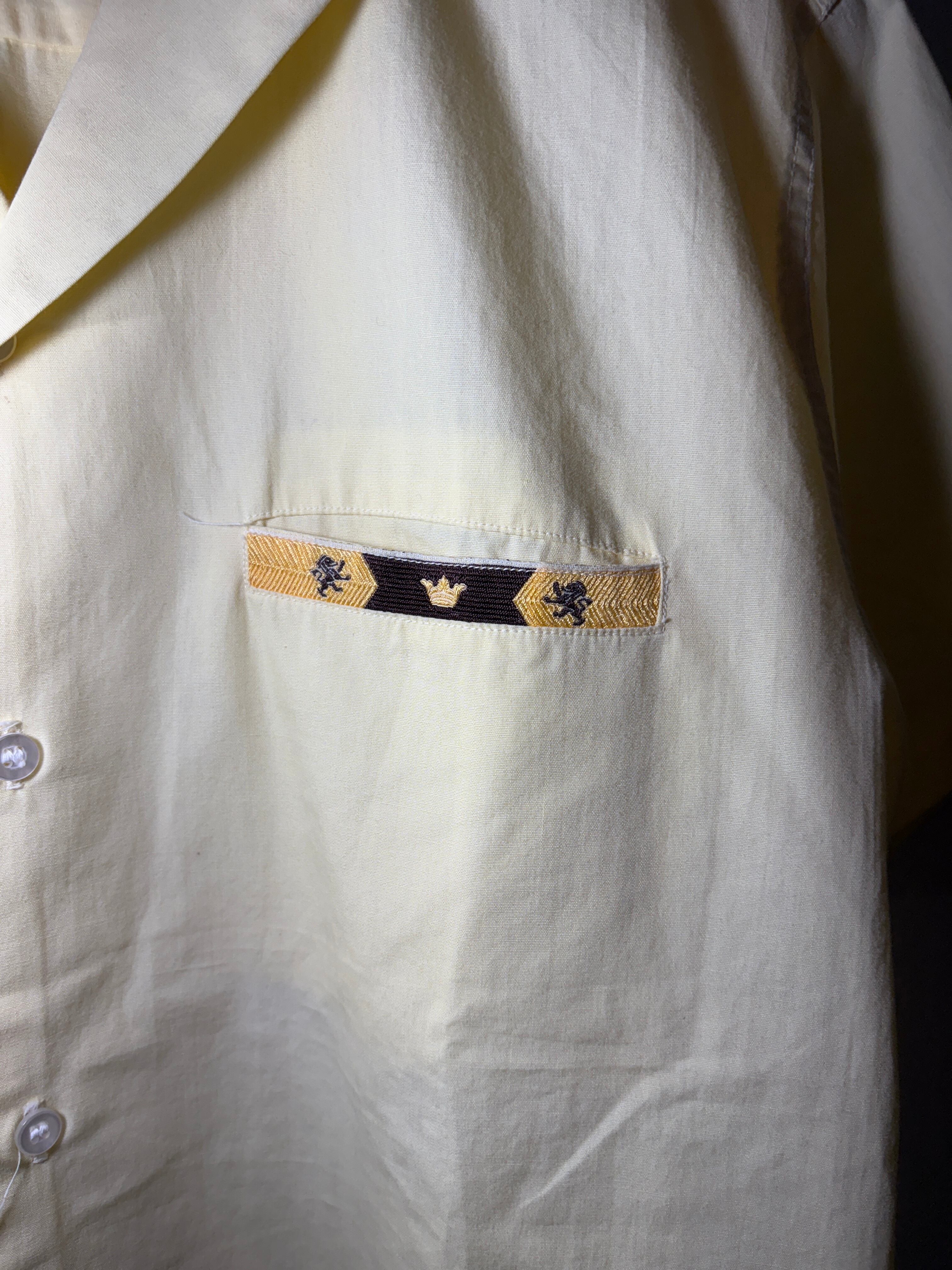 黄色ベースで、開襟使用。胸ポケットのパイピングにも、クラウンとライオンの刺繍が施されていて、豪華かと。